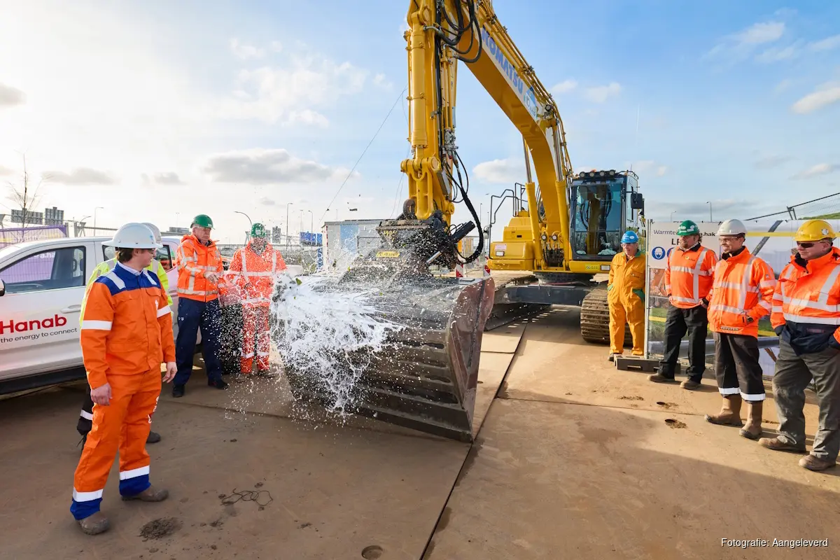 Met het dopen van de eerste bouwkraan geven directieleden van WarmtelinQ en de betrokken aannemers A.Hak en Hanab vandaag het officiële startsein.